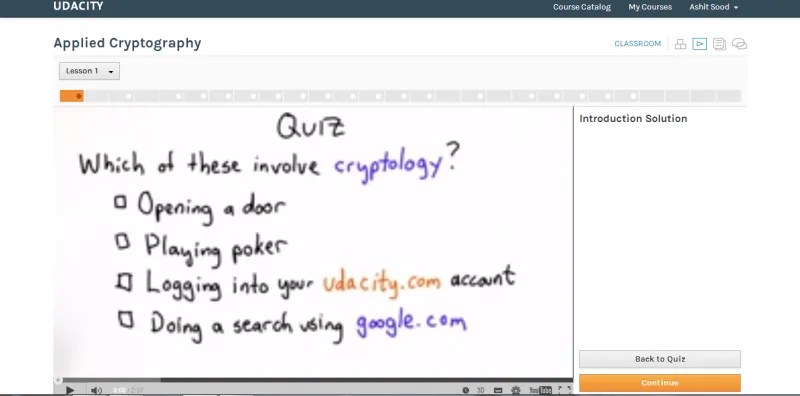 From the catalog choose any of the course for free and when time permits, just go to My Courses to enhance your knowledge and skill set. Below you will find the classroom for the Applied Cryptography. The site has 28 courses as of today but the list is increasing every month. The present course catalog can be browsed at https://www.udacity.com/courses