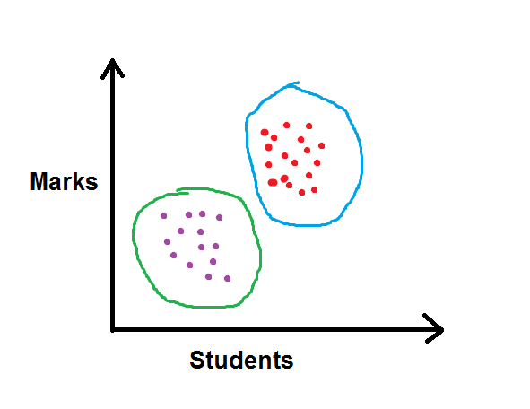 In unsupervised learning, we do not know whether our data set has all the answers. It is our objective to get the interpretation from the data. For example, if we take the same example as above, and the marks of the students are given, but the fact as to who is passed or failed is not given. Thus, when we plot the marks of the students, we will get clusters of students in either phase. This problem is all about clustering and grouping similar/identically related data points into groups.
