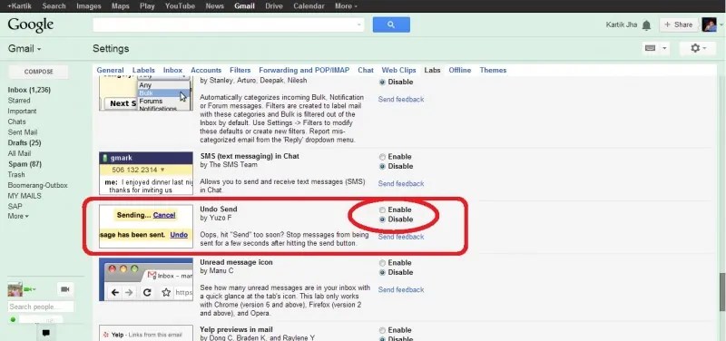 Search for “Undo Send” in “Available Labs” and click on Enable to enable it.